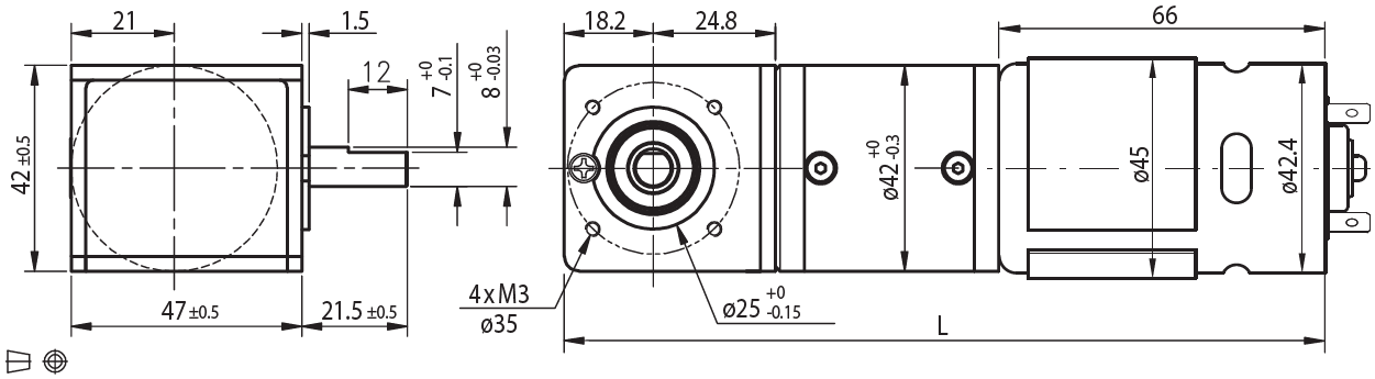 Untersetzungsverhältnis | 12 V Nennmoment (Ncm) | 12 V Nenndrehzahl (min-1) | 24 V Nennmoment (Ncm) | 24 V Nenndrehzahl (min-1) | Länge L (mm) |