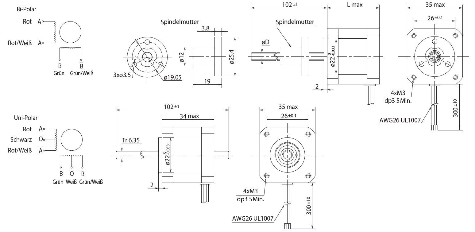 Modell | Nennstrom (A) | Phasen- Widerstand (Ω) | Phasen- Induktivität (mH) | Zuleitung (Nr.) | Haltedrehmoment (Ncm) | Motorlänge L (mm) | Schrittwinkel (°) |