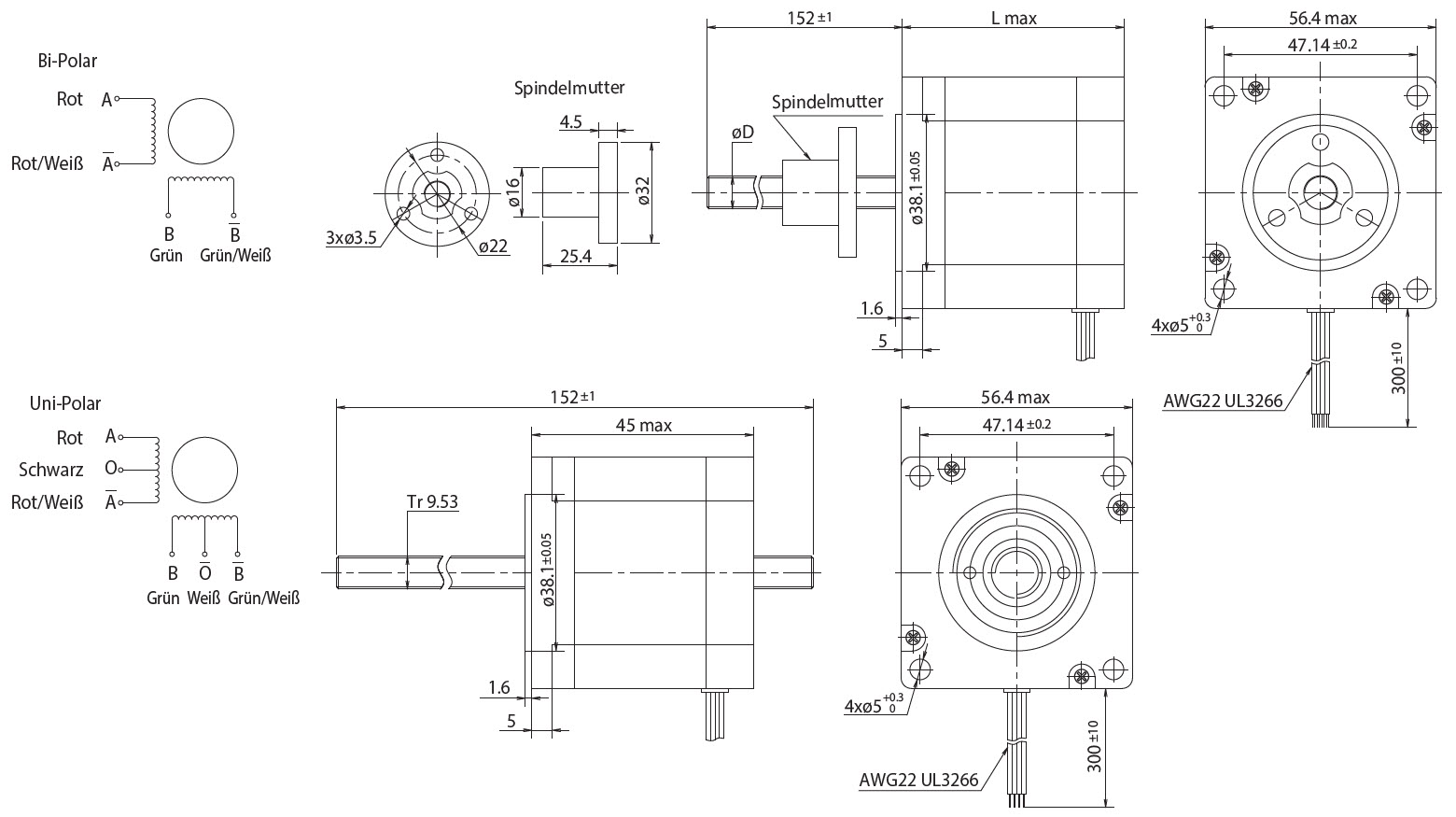 Modell | Nennstrom (A) | Phasen- Widerstand (Ω) | Phasen- Induktivität (mH) | Zuleitung (Nr.) | Haltedrehmoment (Ncm) | Motorlänge L (mm) | Schrittwinkel (°) |